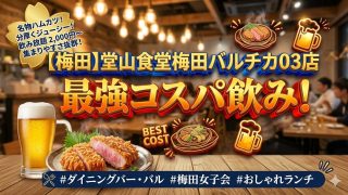 梅田 【梅田】単品飲み放題2,000円から!『堂山食堂 梅田バルチカ03店』仕事帰りにサクッと酔える名店 【梅田】単品飲み放題2,000円から!『堂山食堂 梅田バルチカ03店』仕事帰りにサクッと酔える名店梅田で「とりあえず安く... 2026.03.09 梅田